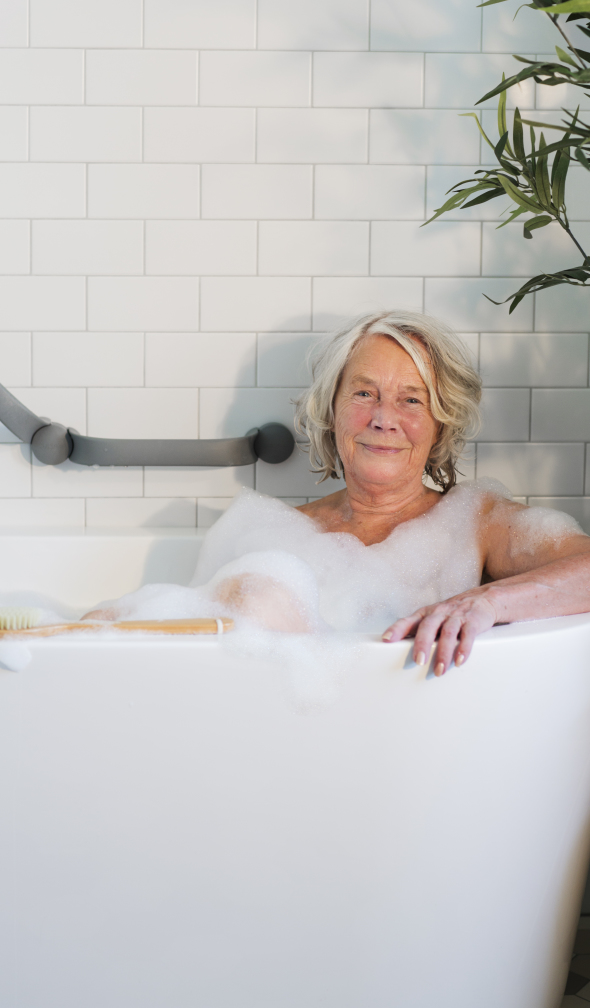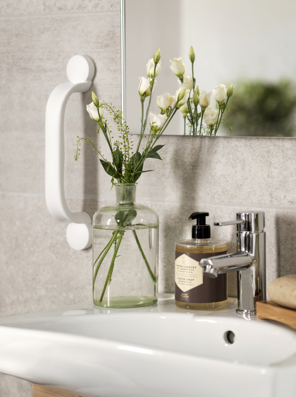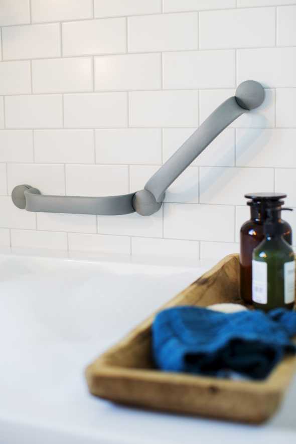 The material of the grab rail and its well-designed shape and surface provide a stable grip even if your hands or the handles are wet. The triangular shape and the thumb support also make you feel safer.