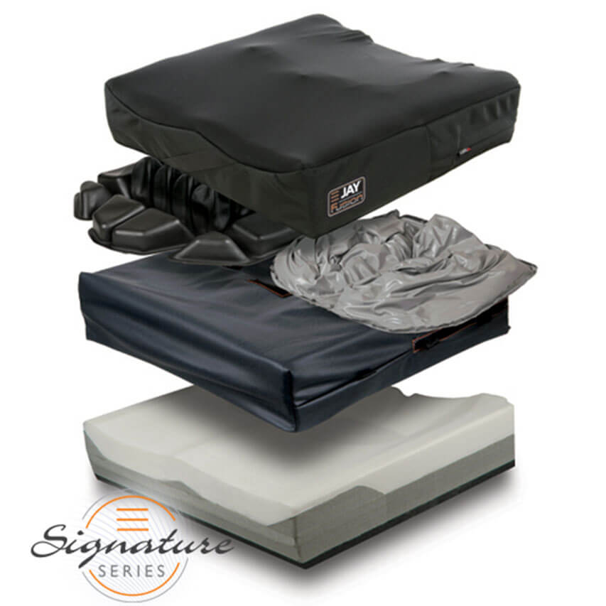 The JAY® Fusion™ is an adjustable wheelchair cushion designed for skin protection that features JAY Flow™ Fluid or ROHO DRY FLOATATION® air insert options in a package that’s comfortable, stable and supportive.