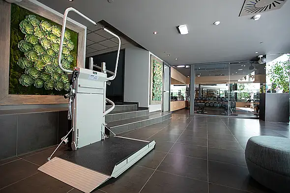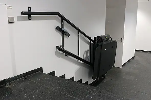 The upper rail tube is clean, smooth and completely closed. It can therefore serve perfectly as a handrail. This feature, combined with the option of large platform sizes, make the Stratos the preferred platform stairlift for commercial application in public buildings.
